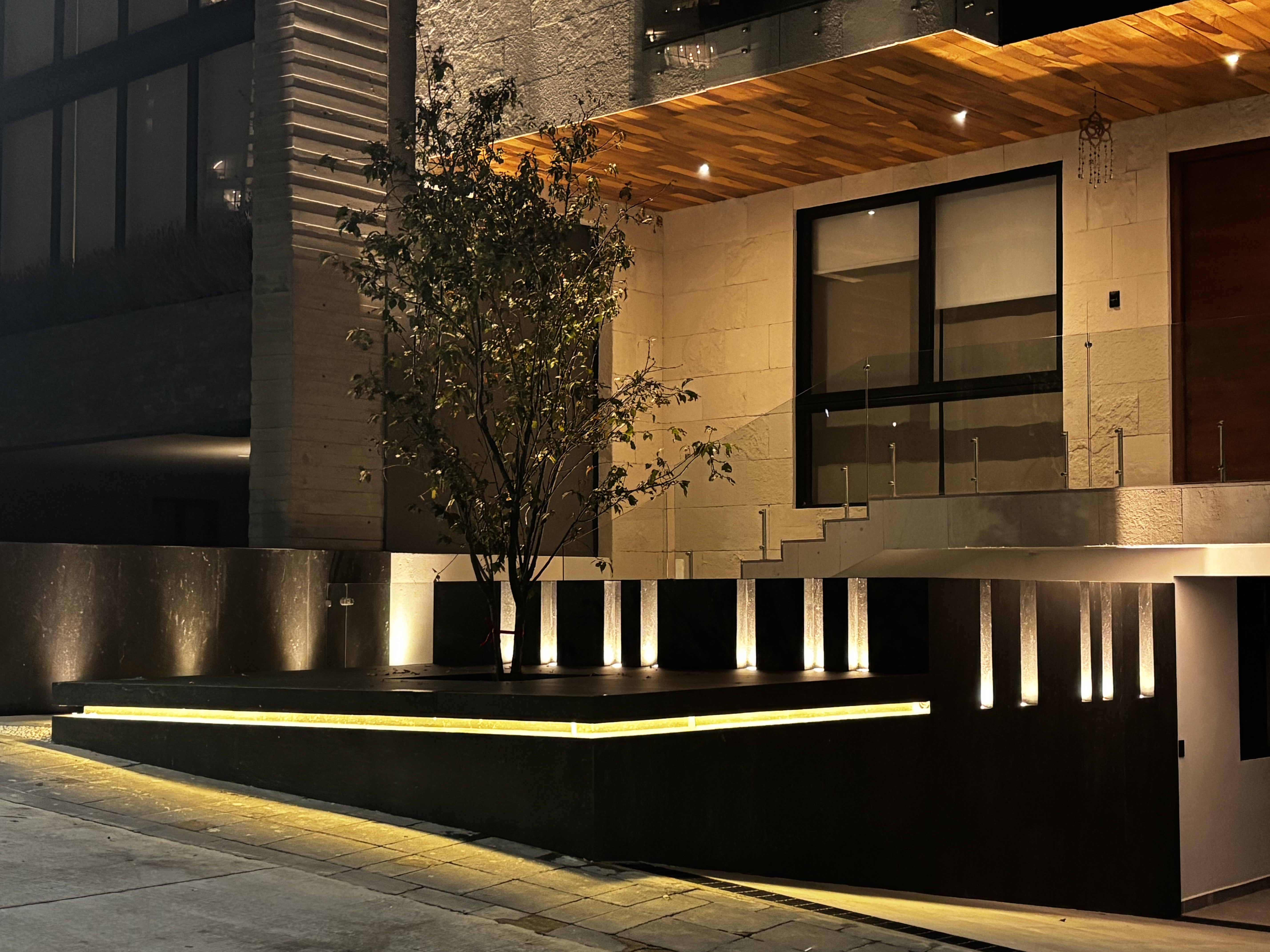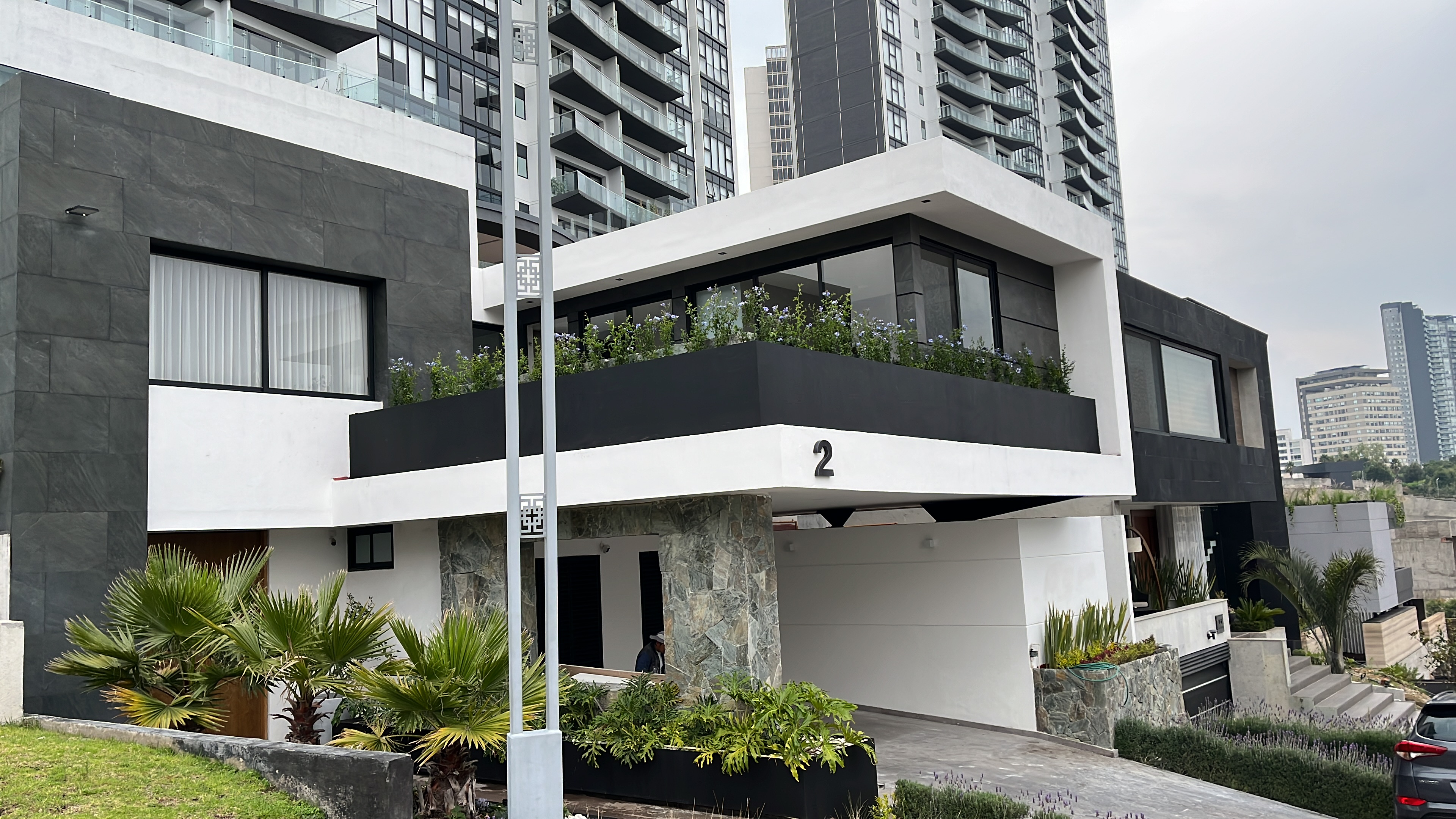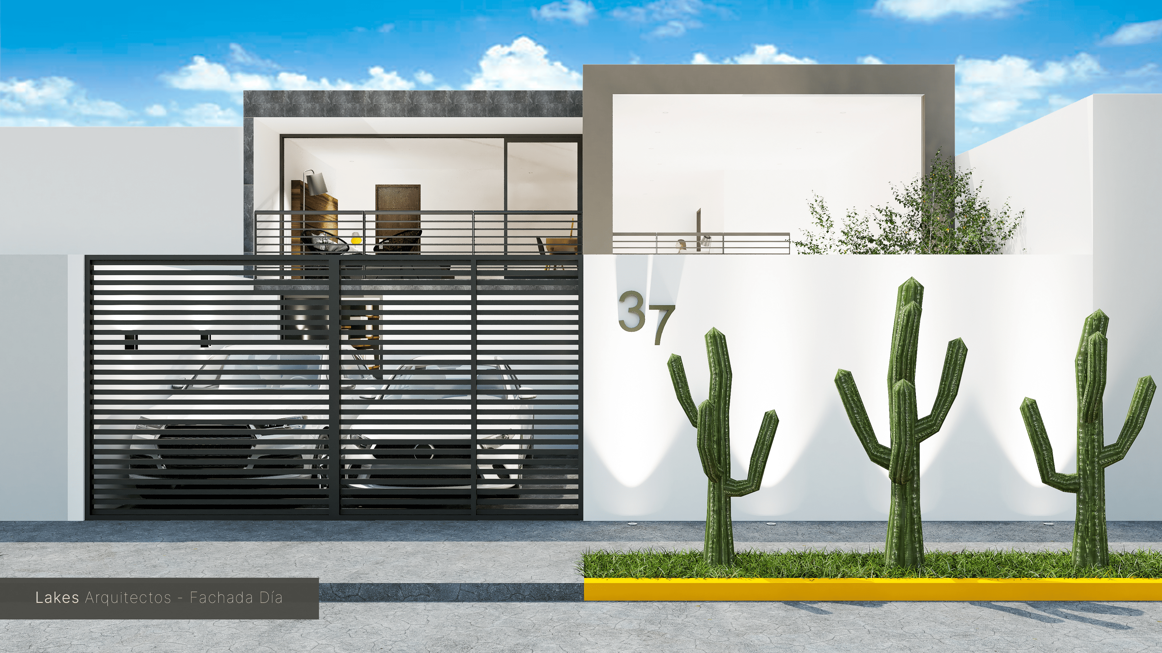 Residencia minimalista contemporánea: volúmenes blancos puros, piedra natural, madera oscura y ventanales amplios que conectan interior con el paisaje, garaje doble ventilado y terraza superior con pérgola. Elegancia funcional y discreta.