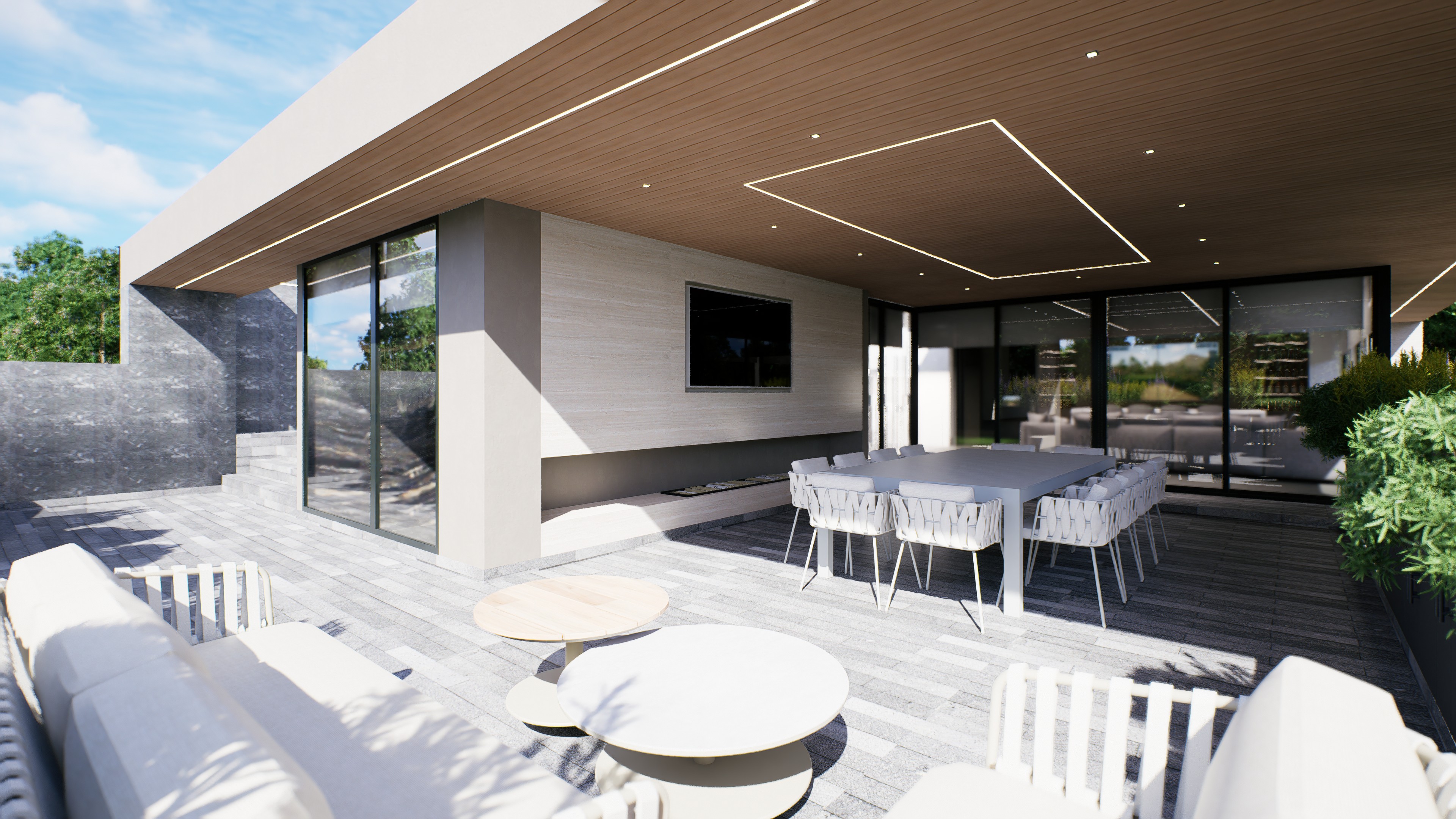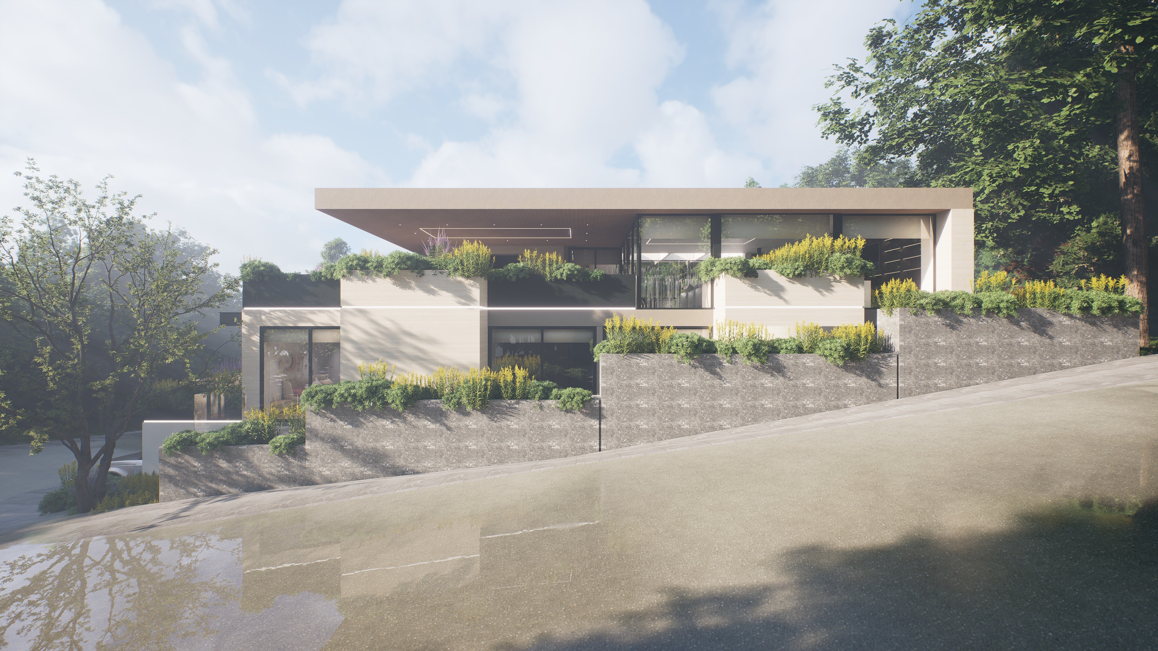 Residencia unifamiliar en Bosque Real donde la arquitectura contemporánea se integra al terreno y al paisaje, combinando espacios familiares, áreas sociales de entretenimiento y una conexión constante con la naturaleza.