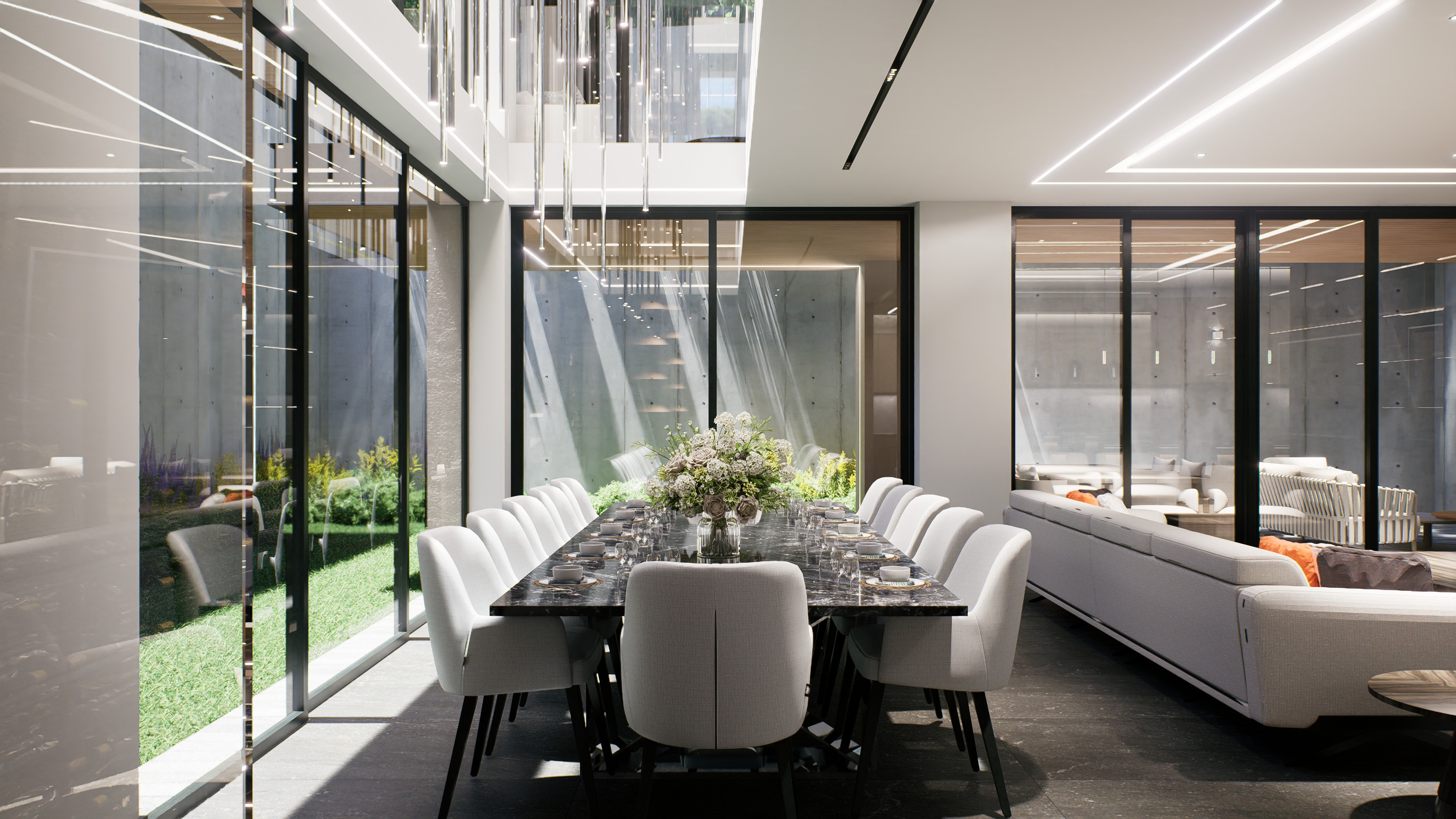 Residencia contemporánea de gran escala en Bosque Real que integra espacios de entretenimiento, dobles alturas protagonistas y luz natural como elemento central del diseño.