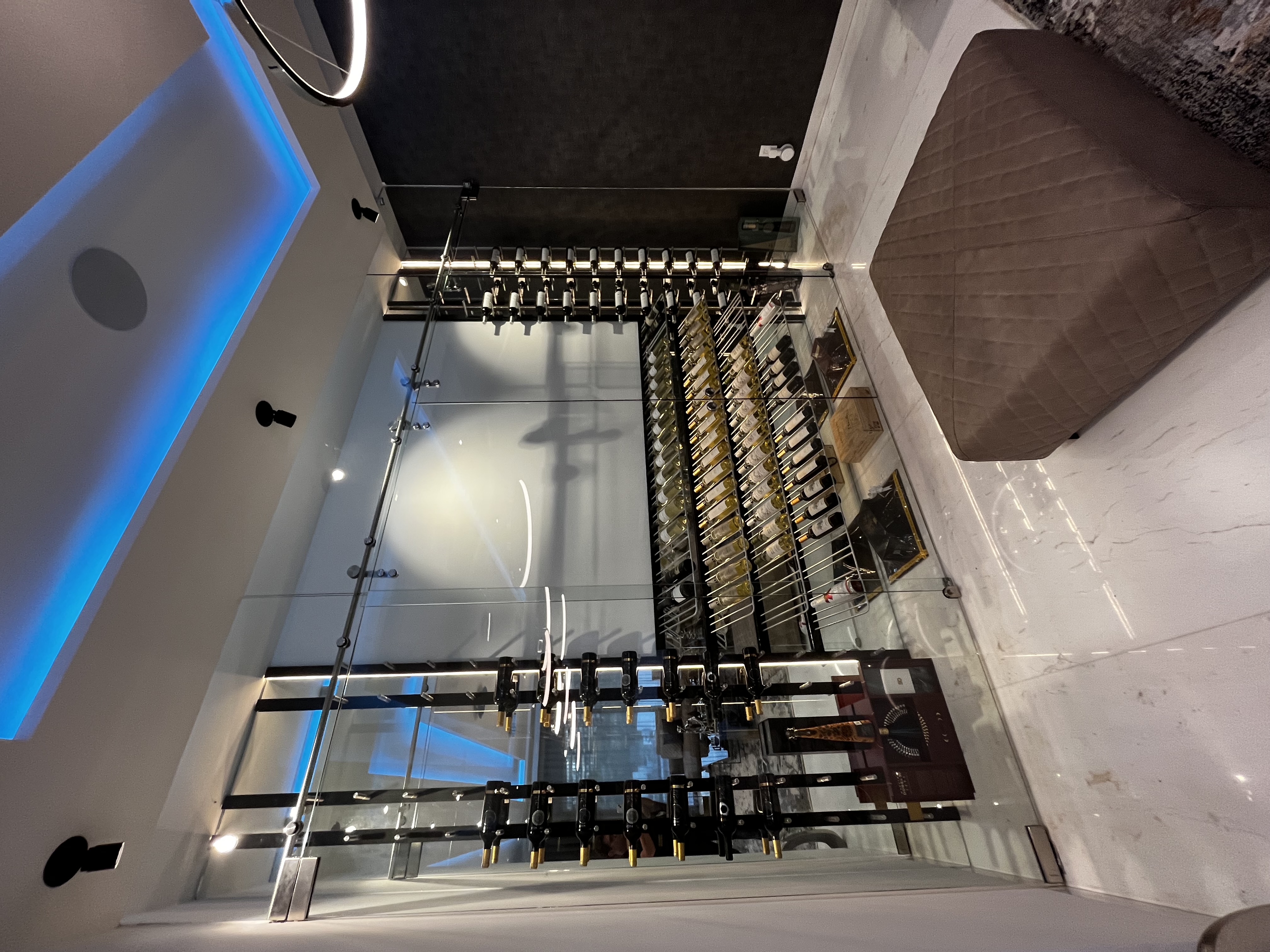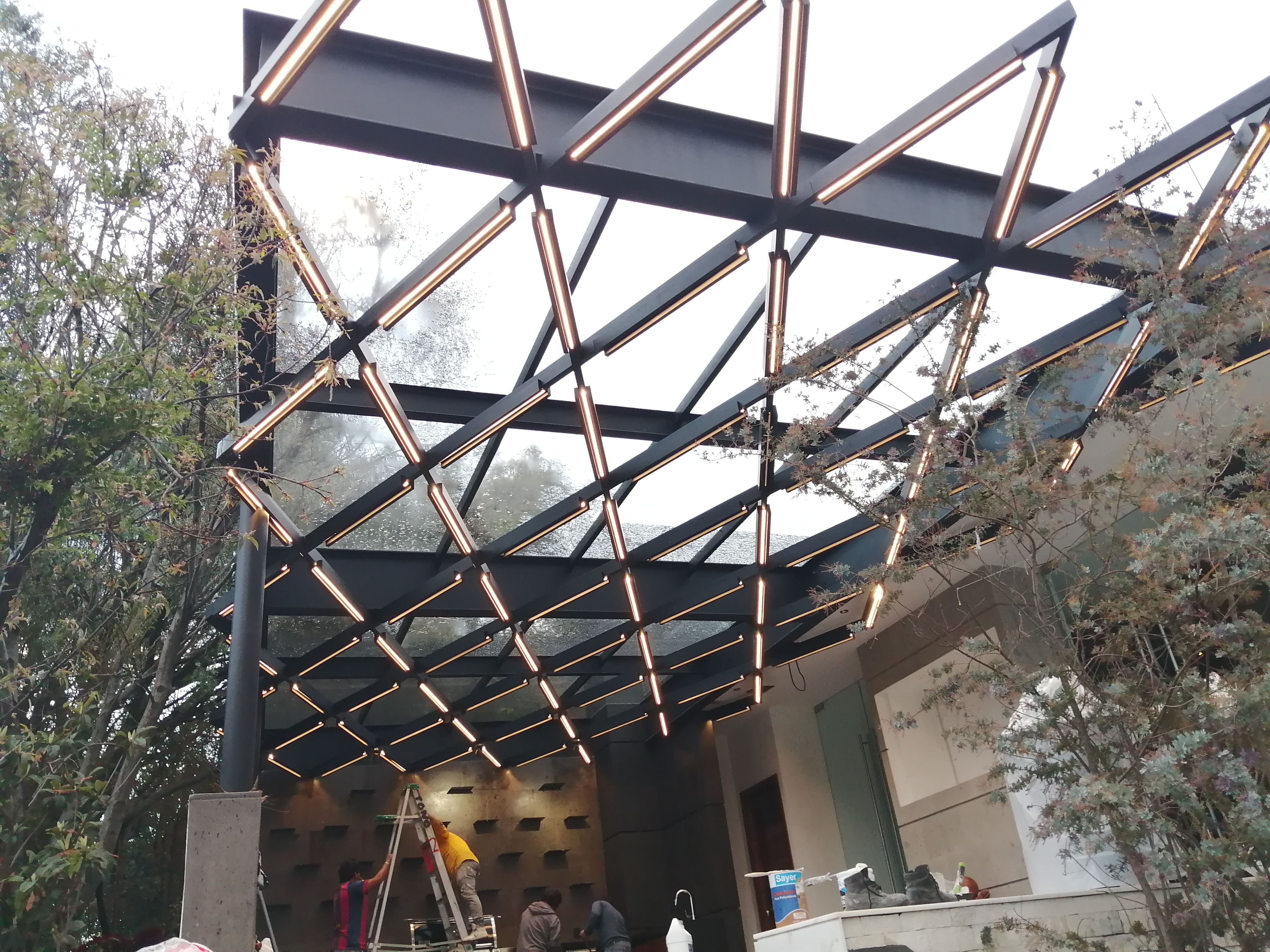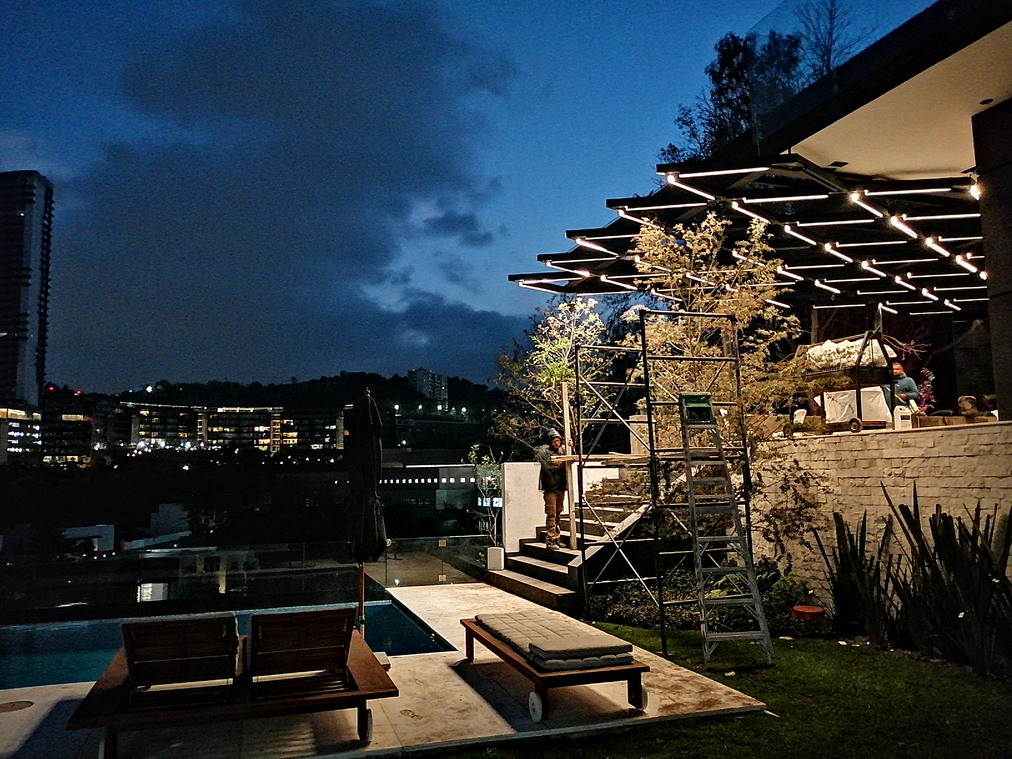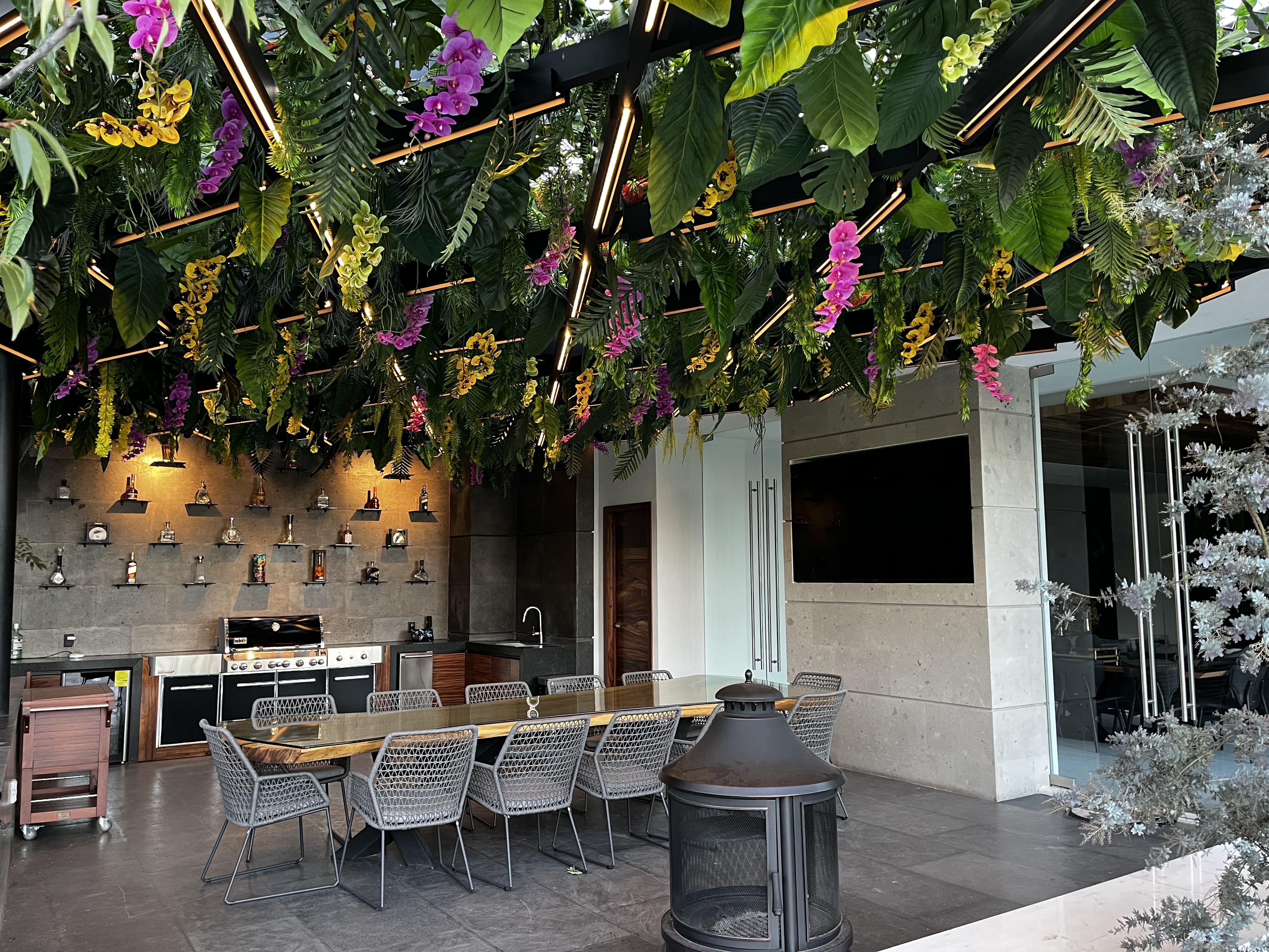 Estructura industrial con iluminación LED integrada y exuberante jardín vertical artificial: follaje tropical, orquídeas y monstera que crean un techo vivo, fusionando naturaleza y diseño moderno en un espacio exterior funcional y sofisticado.