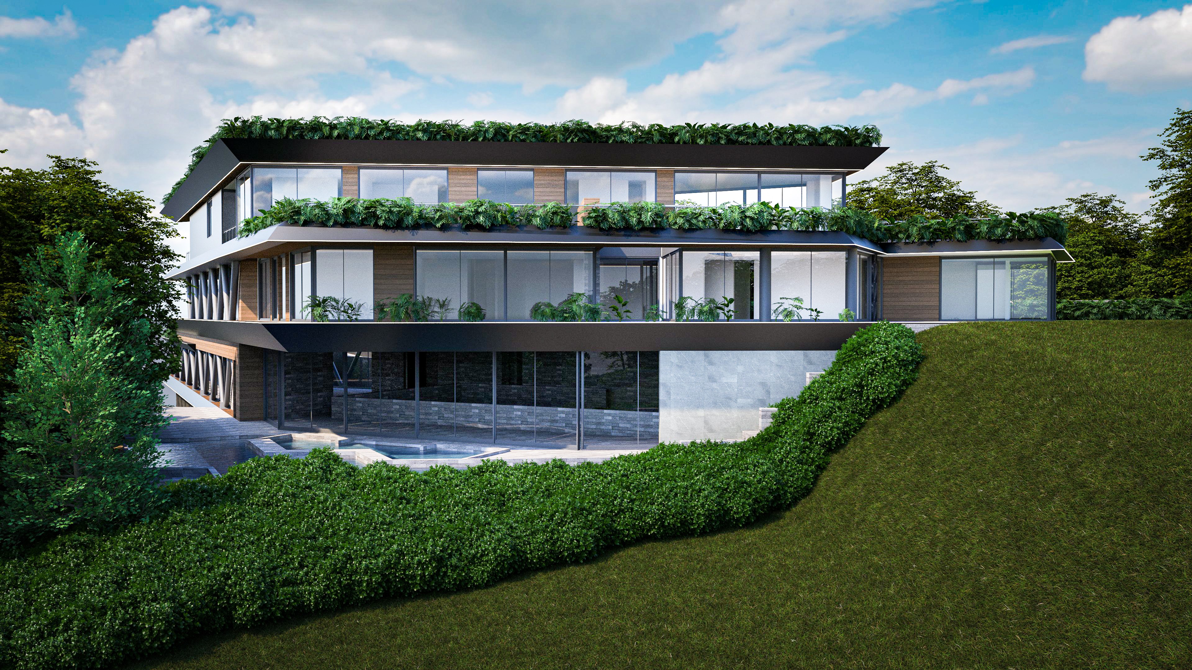 Residencia contemporánea de tres niveles que se adapta a un terreno ascendente, con jardín central, doble altura protagonista y una integración total entre arquitectura, naturaleza y tecnología.