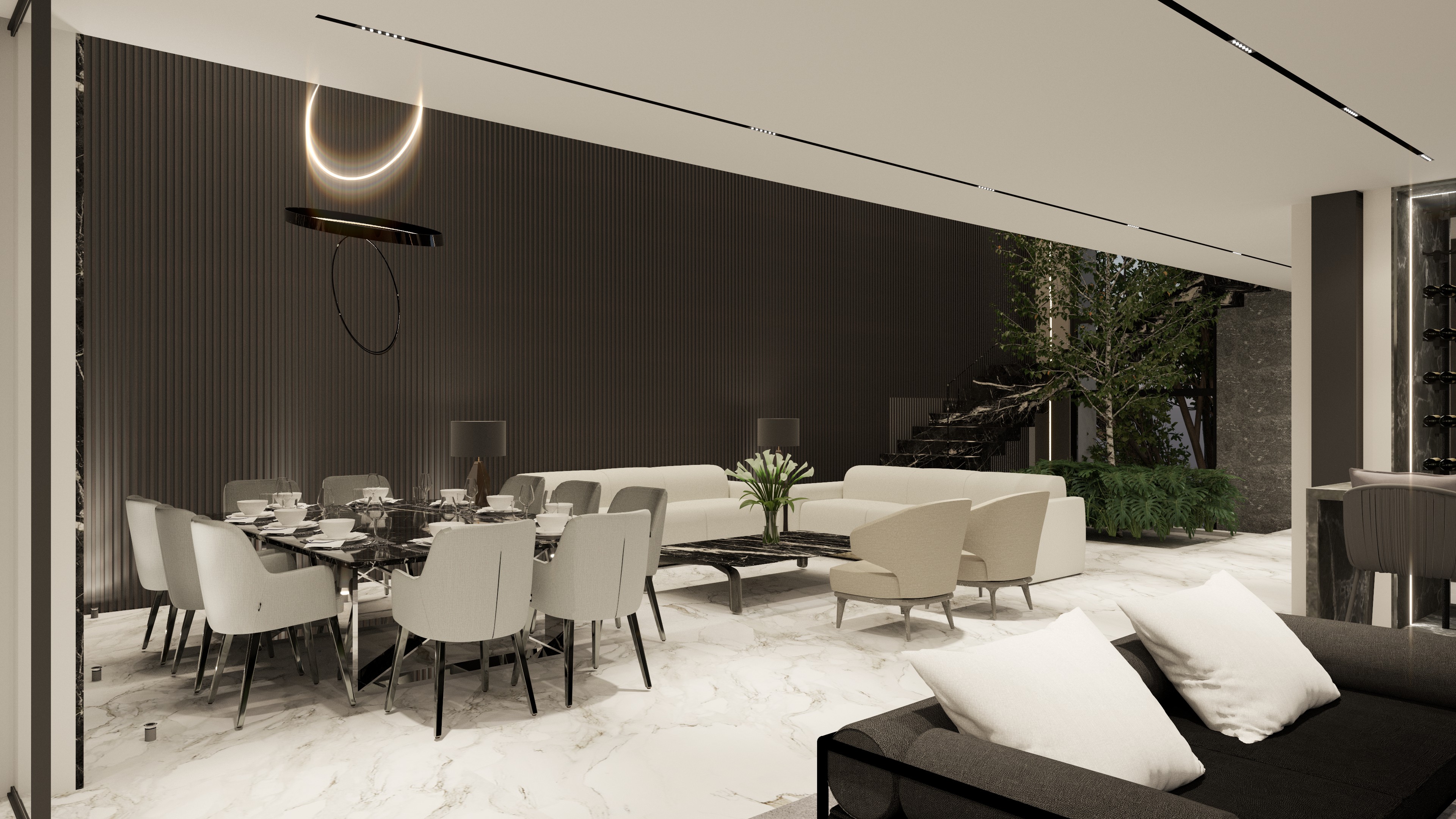 Residencia unifamiliar en Bosque Real donde la arquitectura contemporánea se integra al terreno y al paisaje, combinando espacios familiares, áreas sociales de entretenimiento y una conexión constante con la naturaleza.